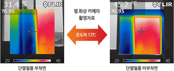 열 화상 카메라 촬영시, 필름을 붙인 쪽과 붙이지 않은 쪽의 온도가 약 13℃의 차이가 나는 것을 확인하실 수 있습니다.